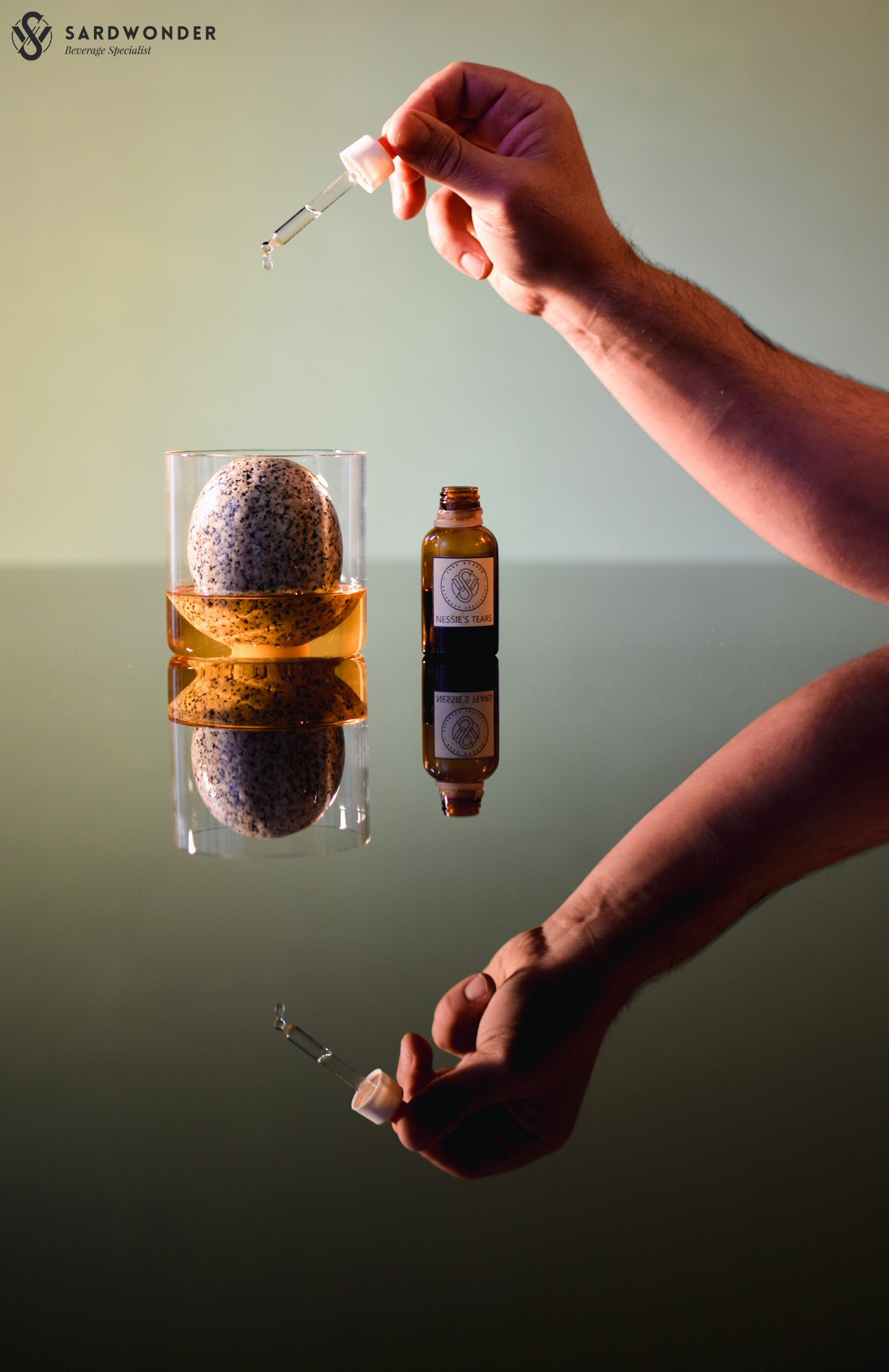 Per quanto riguarda la diluizione siamo rimasti fedeli alla tradizione dei rituali del whisky. Poche gocce d’acqua bastano per aprire e sprigionare meglio i suoi sentori. Partendo da un’acqua oligominerale con un basso residuo fisso, muschi e licheni, abbiamo ottenuto il nostro elisir: Nessie’s Tears (lacrime di Nessie). Un’acqua distillata con leggerissimi sentori erbacei e terrosi, la quale aggiunta al nostro whisky ci trasporta attraverso i nostri sensi nelle vicinanze di un ruscello nella Scozia più settentrionale.